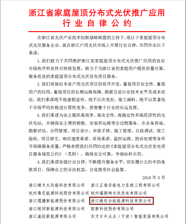 规范浙江省家庭屋顶分布式光伏发电项目的服务流程和行为,提升服务质量和能力,营造和谐的服务环境,促进行业健康和可持续发展,是每一个光伏企业不可推卸的责任,1%的产品,99%的服务,维旺合纵倾力而行!